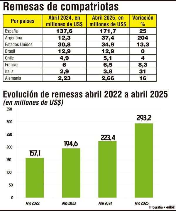 Un fuerte repunte en el envío de dinero desde la Argentina se notó desde enero a abril últimos, totalizando US$ 37,4 millones, que representan un aumento de 204% frente al mismo periodo del 2024 y posicionan a aquel como el segundo país en importancia en el origen de esos recursos. ...[Leer más]
