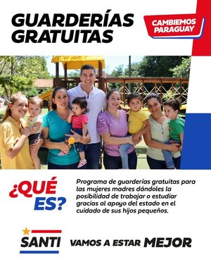 El candidato a presidente de la República por la ANR, Santiago Peña, impulsa un programa de guarderías gratuitas de manera a que el Estado impulse el acceso al mercado laboral de las madres paraguayas. En el día internacional de la mujer, Santi Peña pu...
