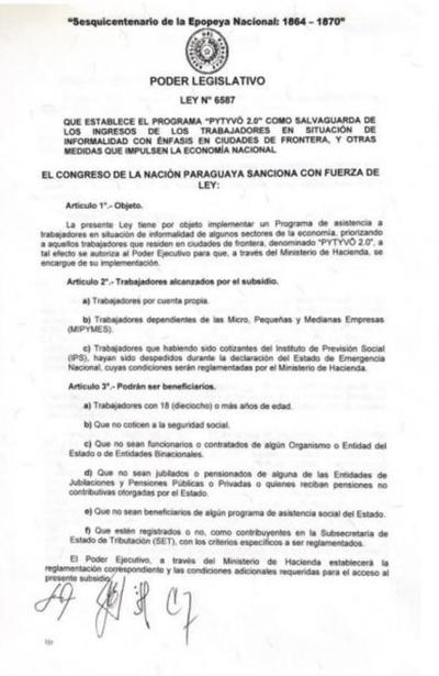 El Presidente de la República, Mario Abdo Benítez promulgó ayer sábado la Ley Nº 6587 que “Establece el Programa Pytyvõ 2.0 como salvaguarda de los ingresos de los trabajadores en situación de informalidad con énfasis en ciudades de frontera, y otras m...