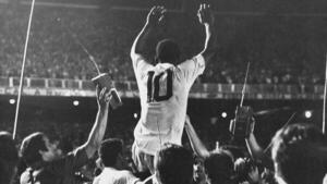 El futbolista paraguayo (centro) nada pudo hacer ante la chilena de gol del ídolo brasileño en el amistoso de 1971 entre Bolívar y Santos.