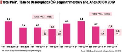 Nuestro país registró una tasa de desempleo del 6,9 % en el primer trimestre de 2019, lo que supone un alza de 1,2 puntos porcentuales respecto a los tres últimos meses del año anterior, según reveló la Encuesta Permanente de Hogares Continua (EPHC), e...
